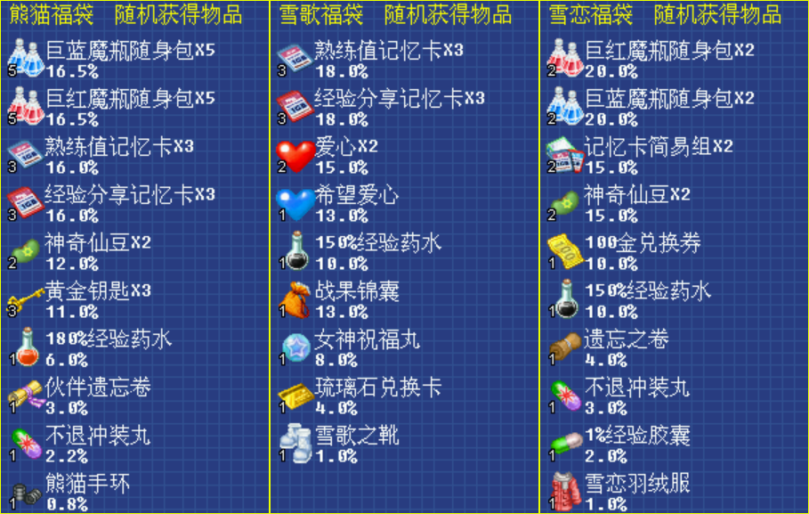 1.福袋上新:【熊猫福袋、雪歌福袋、雪恋福袋】