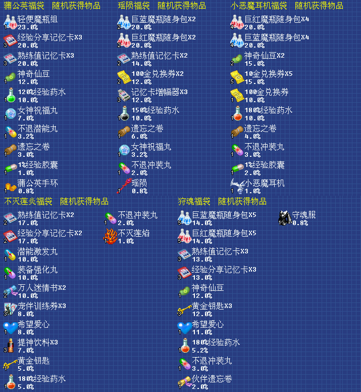 冬雪补给礼包:打开后可获得【200%护装经验汤*1、熟练度记忆卡*10、经验共用记忆卡*10、装备强化药丸*2、激发潜能药丸*2】