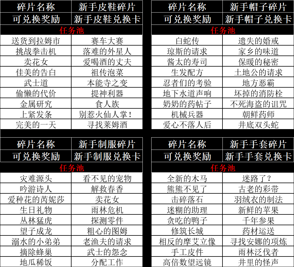 *注:每个任务池内只有10个任务可获得对应碎片,碎片兑换成指定兑换卡在12月11日维护后开启。