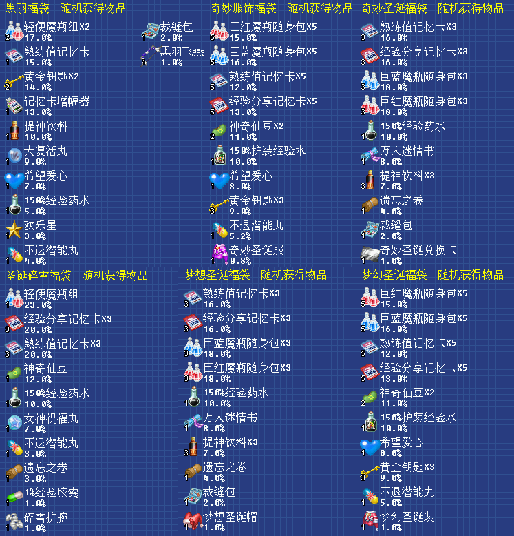 1.福袋上新黑羽福袋、奇妙服饰福袋、奇妙圣诞福袋、圣诞碎雪福袋、梦想圣诞福袋、梦幻圣诞福袋