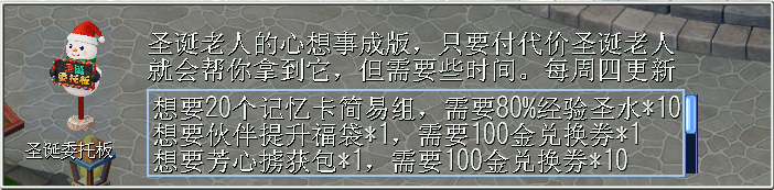 活动期间,圣诞老人也欢迎各位队长大人委托圣诞老人完成指定任务,大家可以在【圣诞委托板】上看到本周圣诞老人接受什么样的委托,然后付出一定的金币或道具,就可以获得对应道具,兑换内容每周四维护后重置。