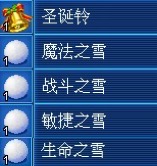 雪球强化卡:打开后可自选【圣诞铃*1】、【魔法之雪*1】、【战斗之雪*1】、【生命之雪】、【敏捷之雪*1】(均不可转让)之一的兑换卡