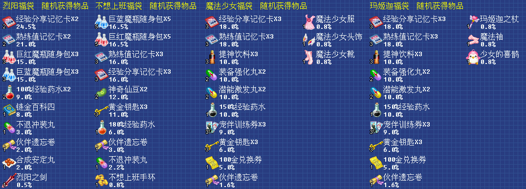 能力礼盒:官网在售礼包,双点后可选择获得五项能力提升丸其中之一的神奇礼盒。