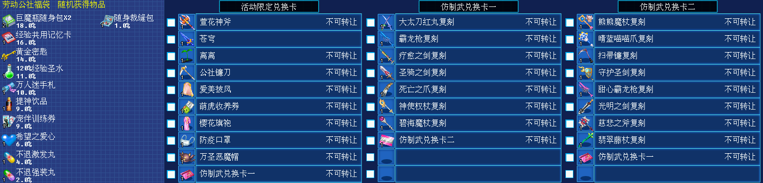 活动内容:活动期间完成副本【机械兽军团】可获得【公社果实*2】、【劳动公社福袋*1】以及12万出战伙伴经验。集齐【公社果实*15】可前往银行NPC【活动熊猫处】兑换【活动限定兑换卡】以及其他优质奖励。