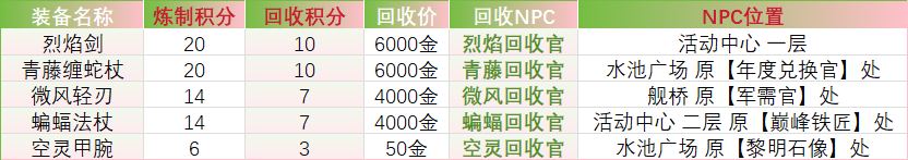 本周开放【炼金挑战赛】与【炼金装备回收】,活动期间炼制指定装备或完成指定装备回收均可获得对应积分,累计获得一定积分可获得丰厚奖励哦!活动积分第一的玩家可获得【炼金宠物兑换卡】、【特殊的祝福】、【能力礼盒】欢迎各位队长大人们积极地参与喔! 4月30日7:00-5月7日7:00为配合【炼金装备回收】,原兑换NPC【年度兑换官、军需官、巅峰铁匠、黎明石像】将限时关闭,同时原位置将刷新兑换NPC为【青藤回收官、微风回收官、蝙蝠回收官、空灵回收官】,银行开放NPC【烈焰回收官】,请各位参与【炼金装备回收】活动的队长大人根据自身需要前往进行回收。