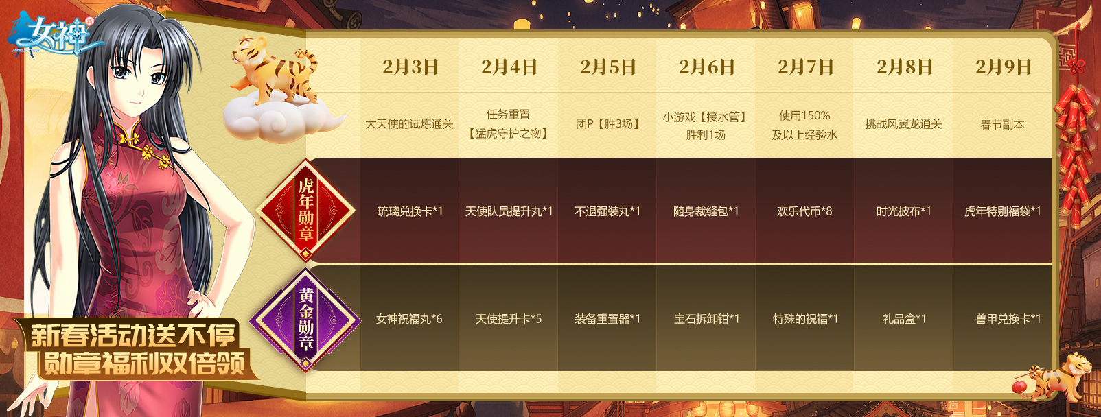 活动1.勋章助力春节活动内容:活动期间每天将会有不同的活动被【虎年系列勋章】进行助力,【虎年勋章】使用后可在不参与当天春节活动的情况下,直接获得一份当天的春节活动加码奖励(如已参加当天的春节活动,则活动奖励翻倍);【黄金虎年勋章】使用后会根据使用数量按照活动日历逐次发放对应的黄金勋章奖励;每天被助力的活动可以通过点击游戏内的活动查看。