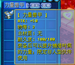 兽甲兑换卡:可自由选择兑换【魔力兽甲】或【力量兽甲】。魔力兽甲:MATK+50,限非人型伙伴使用