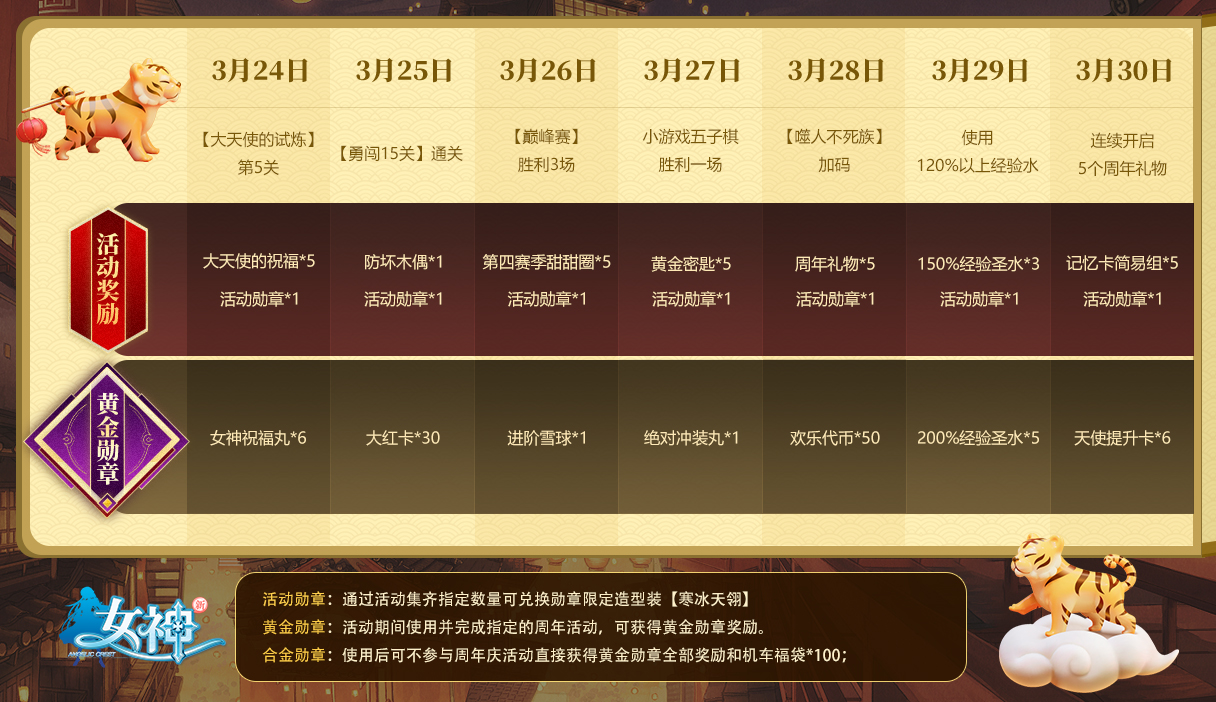 活动内容:周年庆期间每天将会通过不同活动掉落【活动勋章】,同时点数商城将上架【黄金勋章】和【合金勋章】,活动期间收集虎年勋章可用来前往活动中心一层NPC【勋章兑换官】处兑换【寒冰天翎】等精美道具;