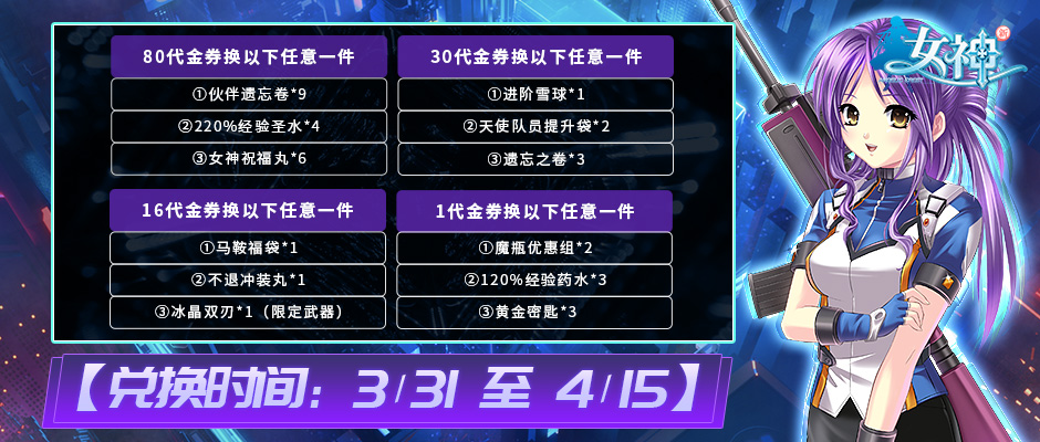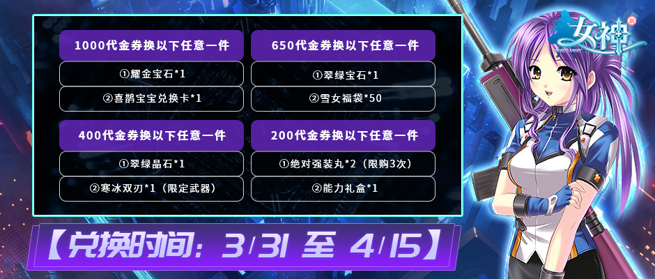 10:1的比例发放代金券,不足10点数的部分不发放代金券;例如小小官在4月1日消耗255点数,则会在4月2日维护后获得【女神代金券*25】。