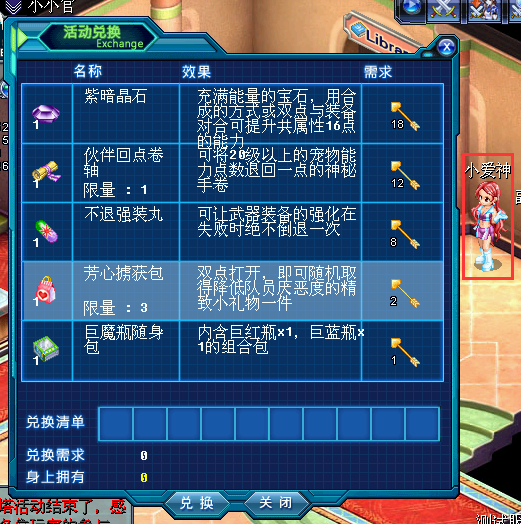 爱神之箭:可用来前往银行NPC 【小爱神】处兑换精美道具,同时活动期间累计获取【爱神之箭】达到20枚,活动结束后可获取【星河情人伞*1】。