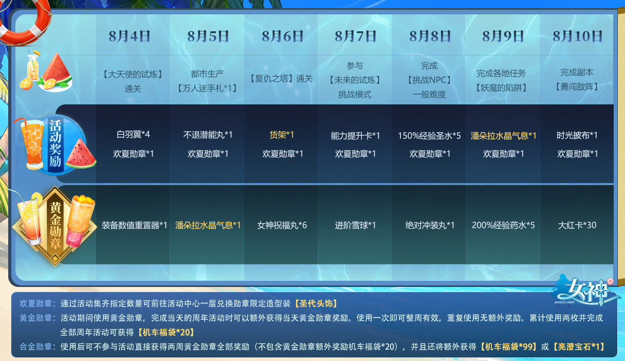 物品说明:活动期间使用黄金勋章,完成当天的周年活动时可以额外获得当天黄金勋章奖励。使用一次即可整周有效,重复使用无额外奖励。累计使用两枚并完成全部【夏日派对】活动可获得【机车福袋*20】;