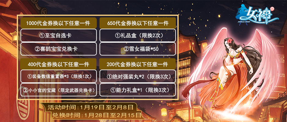 活动内容:1月19日更新后【小小官de店】将正式开启【女神代金券】获取,活动期间各位队长大人可以通过指定的互动方式和点数消耗等不同的游戏内外途径获得一定数量的【女神代金券】,1月28日开启奖励兑换,在规定的兑换时间内可通过联系官官(QQ:1401978503)换取对应价值的道具,各位队长大人还在等什么?快行动起来吧!