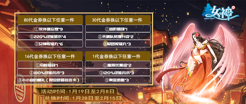 活动内容:1月19日更新后【小小官de店】将正式开启【女神代金券】获取,活动期间各位队长大人可以通过指定的互动方式和点数消耗等不同的游戏内外途径获得一定数量的【女神代金券】,1月28日开启奖励兑换,在规定的兑换时间内可通过联系官官(QQ:1401978503)换取对应价值的道具,各位队长大人还在等什么?快行动起来吧!