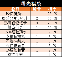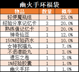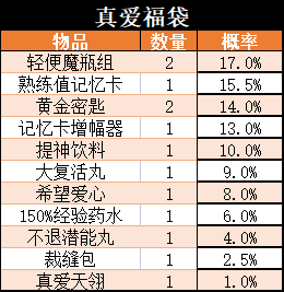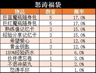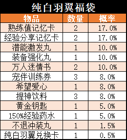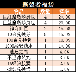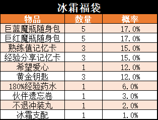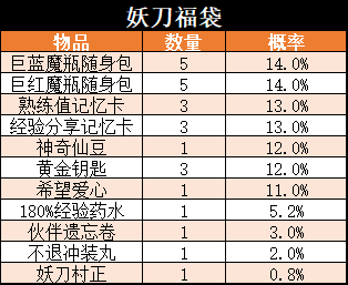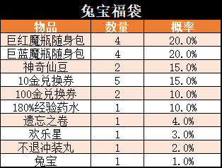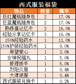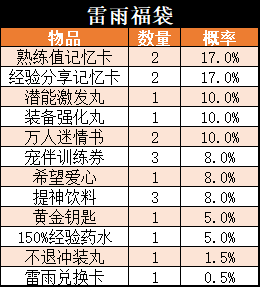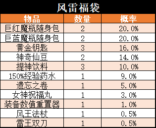 ①头奖概率为1%的福袋,保底规则为:来需开启180个对应福袋从未获得头奖,可申请保底奖励(包含风雷福袋和西式服装福袋,保底规则为:连续开启【风雷福袋*180(西式服装福袋*180)】从未获得【风王法杖或雷王双刀(烈阳炎服或大津波服或西式服装兑换卡)】其中任意一件道具,可申请对应的保底奖励)。