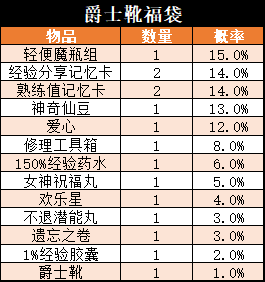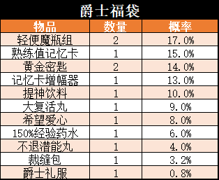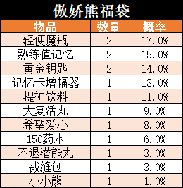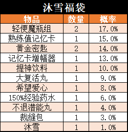 【烟雨福袋】、【沐雪福袋】、【爵士靴福袋】、【暗红之手福袋】、【撕裂者福袋】、【樱花福袋】、【傲娇熊福袋】