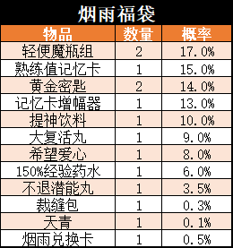 ②头奖概率为0.5%的福袋,保底规则为:来需开启300个对应福袋从未获得头奖,可申请保底奖励(烟雨福袋保底规则为:连续开启【天青福袋*300】从未获得【烟雨兑换卡】可申请保底奖励)。
