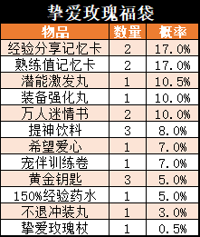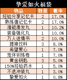 ①活动期间完通过官方渠道(福袋开启或保底奖励)获得【挚爱玫瑰杖】、【挚爱如火】、【挚爱光环】、【挚爱手环】四件其中之一并获得【挚爱之靴】,可联系官官后获得【能力提升卡*1】、【希望之爱心*3】.