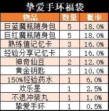 打开后可获得【挚爱手环福袋*1】、【挚爱如火福袋*1】、【挚爱玫瑰福袋*1】、【挚爱光环福袋*1】、【爱的箴言*1】的礼盒