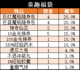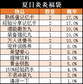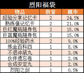 物品说明:有机会获得炎/冰狱之剑等优质道具,炎冰狱兑换礼盒0.5%,不退冲装丸3%,伙伴遗忘卷3%,炼金百科四8%,炼金百科三8%,90%经验药水9%,经验分享记忆卡24.5%,熟练值记忆卡20%,巨蓝魔瓶随身包12%,巨红魔瓶随身包12%。