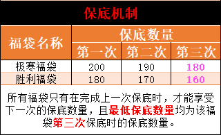 活动调整:福袋保底将采用逐次降低保底数量的机制,凡是参与本期福袋保底活动得福袋均分为三种保底数量,满足条件时即可享受对应的保底数量。