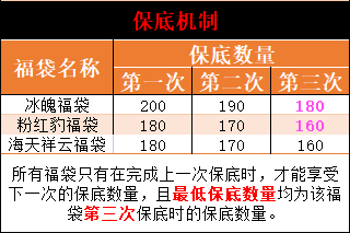 活动调整:福袋保底将采用逐次降低保底数量的机制,凡是参与本期福袋保底活动得福袋均分为三种保底数量,满足条件时即可享受对应的保底数量。