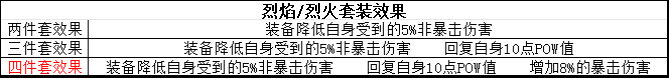 烈火长枪(武器):MATK+100,SPD+50,受到火属性技能伤害降低5%,可与【风霜长枪】进行合成升级,升级后收到水或火属性技能伤害均可降低5%。装备烈火套装时可享受额外的装备加成。