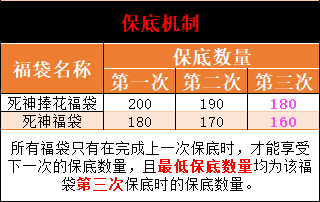 活动调整:福袋保底将采用逐次降低保底数量的机制,凡是参与本期福袋保底活动得福袋均分为三种保底数量,满足条件时即可享受对应的保底数量。