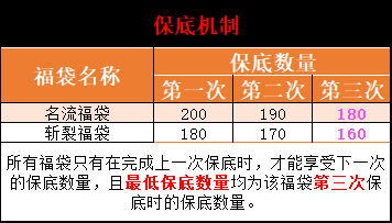 活动调整:福袋保底将采用逐次降低保底数量的机制,凡是参与本期福袋保底活动得福袋均分为三种保底数量,满足条件时即可享受对应的保底数量。
