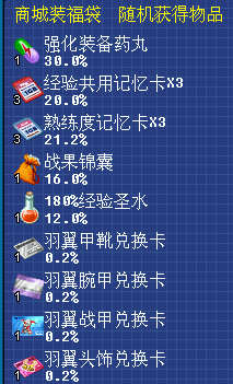 欢乐代币*50、遗忘卷轴*1、伙伴回点卷轴*1、琉璃石兑换卡*3、商城装福袋(不可交易)*10