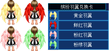 缤纷羽翼兑换卡:累计储值12000点获得的稀有兑换卡,打开后可自选一件稀有配色的可交易造型羽翼。