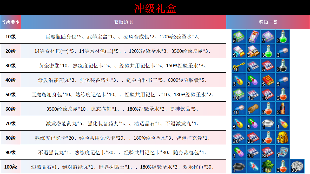 活动内容: 为了提升各位队长大人的游戏体验,各位队长大人在【时空危机】服务器创建角色后均可获得【冲级礼盒*1】、【激发潜能药丸*50】、【伙伴回点卷轴*2】,队长大人每提升10级均可获得丰富奖励哦!