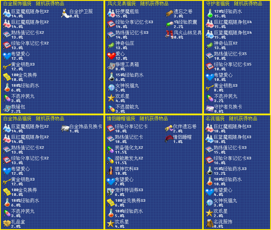 1.福袋上新:【白金服饰福袋、白金饰品福袋、风火足具福袋、情侣睡帽福袋、守护者福袋、名流福袋】